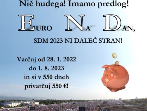 Hočeš v Lizbono na Svetovni dan mladih, a je problem denar? Nič hudega! Imamo predlog! EURO NA DAN, SDM 2023 NI DALEČ STRAN! Varčuj od 28. 1. 2022 do 1. 8. 2023 in si v 550 dneh privarčuj 550 €!