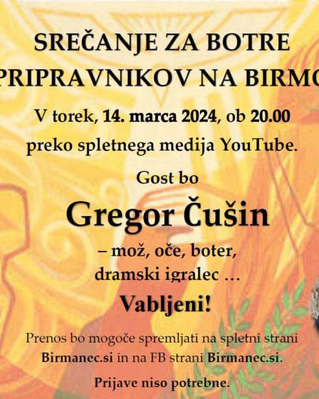 V četrtek, 14. marca 2024, ob 20.00 preko spletnega medija YouTube. Gost bo Gregor Čušin – mož, oče, boter, dramski igralec … Prenos bo mogoče spremljati na spletni strani Birmanec.si in na FB strani Birmanec.si. Prijave niso potrebne. Vabljeni!
