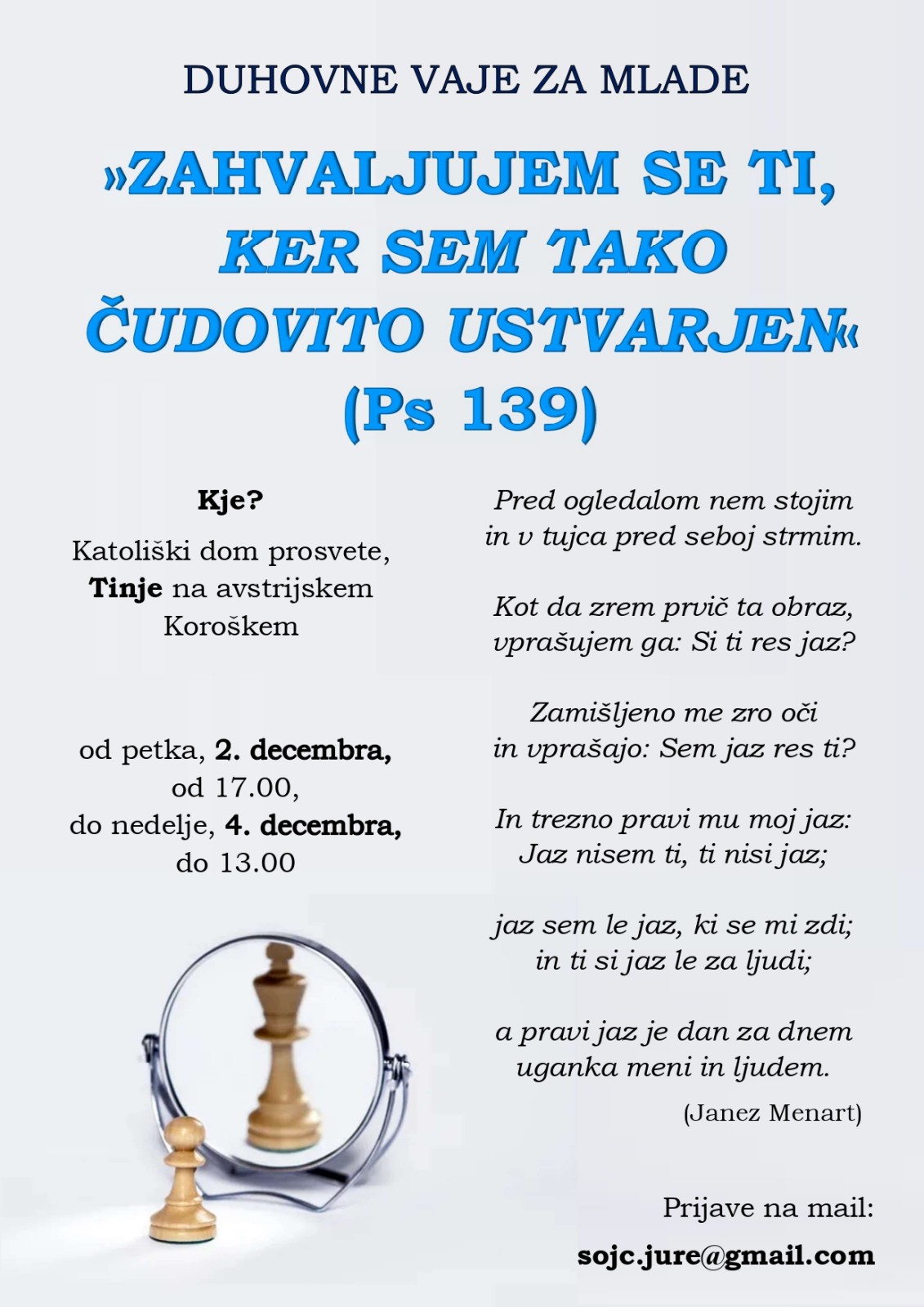 Duhovne vaje so prestavljene s konca oktobra na prvi vikend v decembru (2.-4. 12. 2022). Prispevek za duhovni vikend je 50 € in vključuje polni penzion in prevoz v Tinje in nazaj.