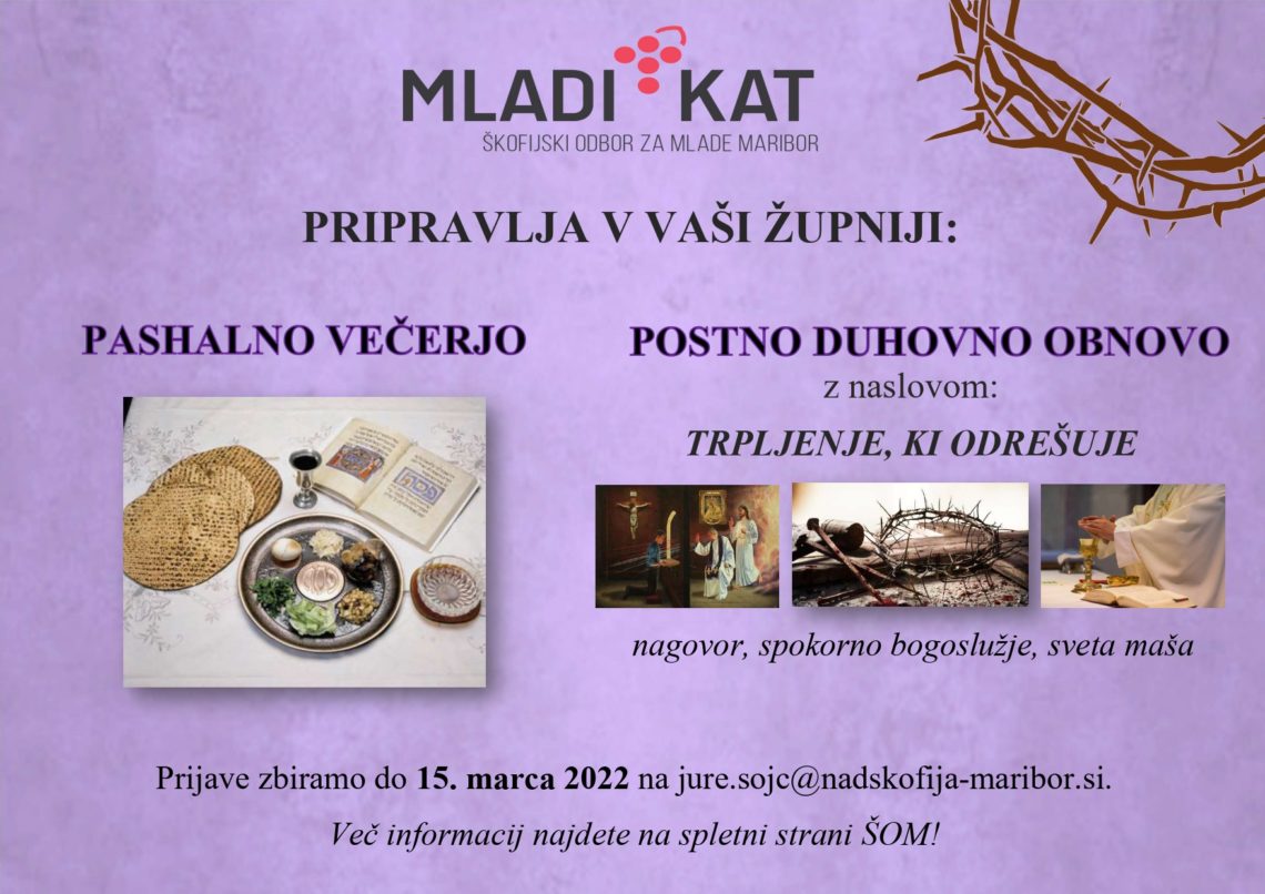 Za postni čas vam ekipa ŠOM ponuja možnost izvedbe postne duhovne obnove za mlade v vaši župniji. Tema duhovne obnove je TRPLJENJE, KI ODREŠUJE. Duhovna obnova traja štiri ure in vključuje sveto mašo in spokorno bogoslužje.